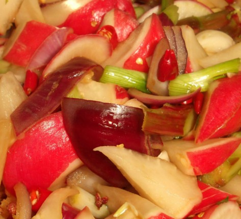 5)櫻桃蘿卜大一點的對半切開,生姜切片,芹菜切段。